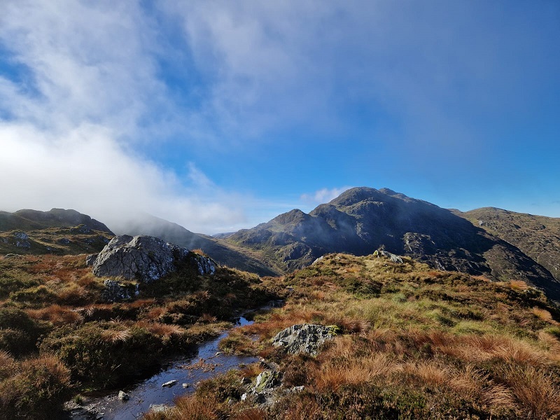 Welcome piece stop in the trees before setting off again to reach Bealach na h-Imriche, and the start of the “steep bit”! Although this hill is not classed as a Munro or Corbett it is a challenging hike with a narrow rocky path near the summit and several boggy sections.