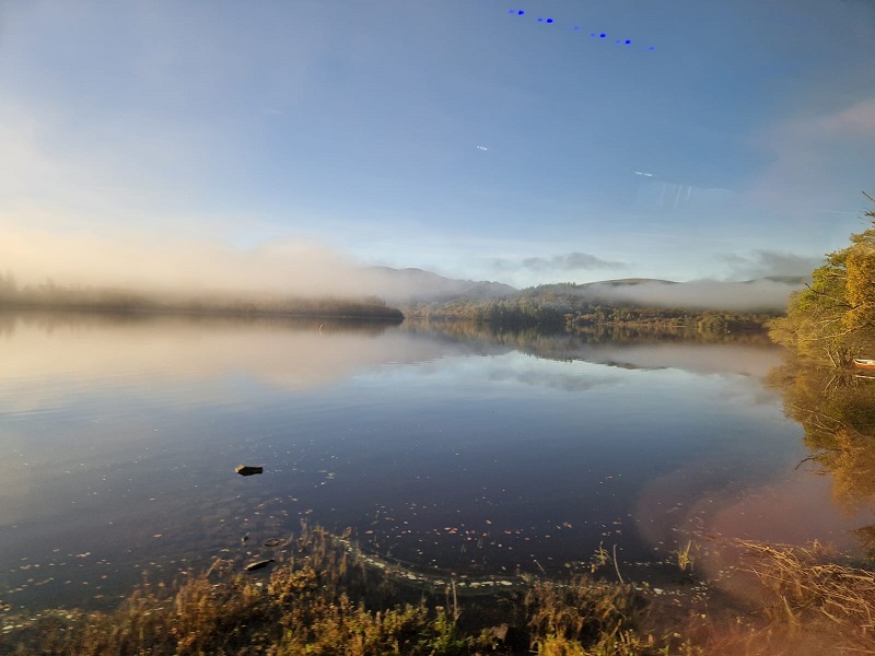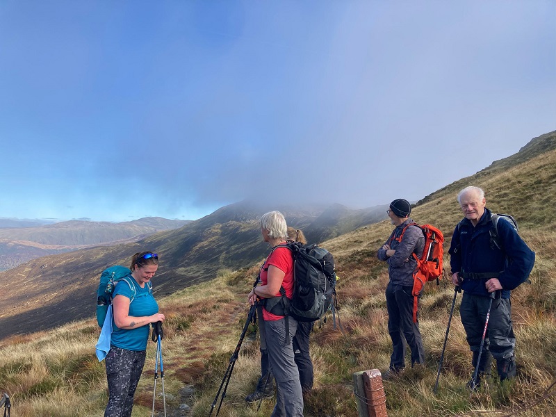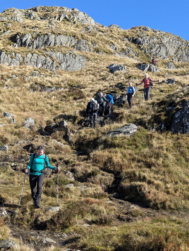 It was early October, season of autumn mists when club members ventured to the Trossachs to climb Ben Venue. Starting from near Ledard farm by Loch Ard an area which Walter Scott brought into his novels Waverley and Rob Roy. Mist low down all the way from Blair but this soon cleared as we made our way in broadleaf woodland by the Ledard burn. Only 14 walkers so we all decided to do the A/B walk.