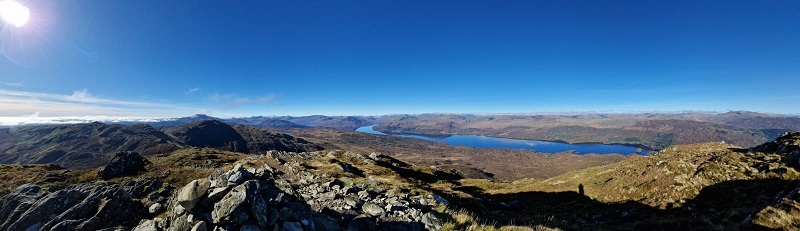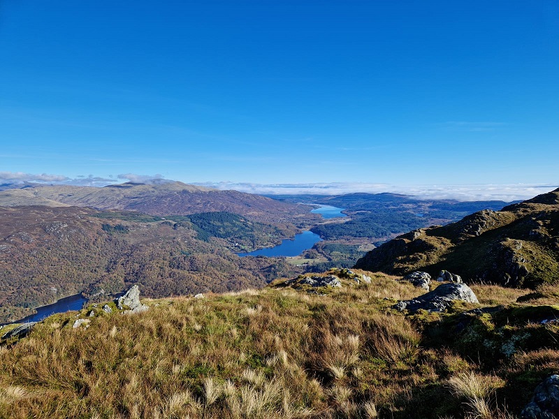 The panorama at the summit rewarded walkers with “calendar shot views” over Loch Katrine and Loch Venacher. Sir Walter Scott again came to mind as we spied a tiny dot, the Lady of the Lake, making her way up Loch Katrine. Lunch on the summit in warm sunshine, enjoying splendid views. Thereafter we retraced steps to the bealach and then branched off southwards into Gleann Riabhach and forests to meet the coach. An excellent example of using coach transport to allow walkers to enjoy a through walk with a variety of scenery